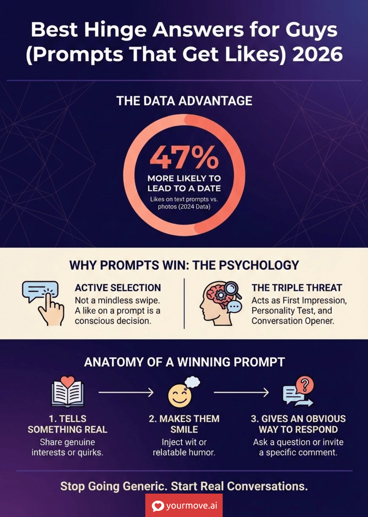 In 2024, likes on text prompts were 47% more likely to lead to a date than likes on photos—making well-written prompts the single highest-leverage move on Hinge.